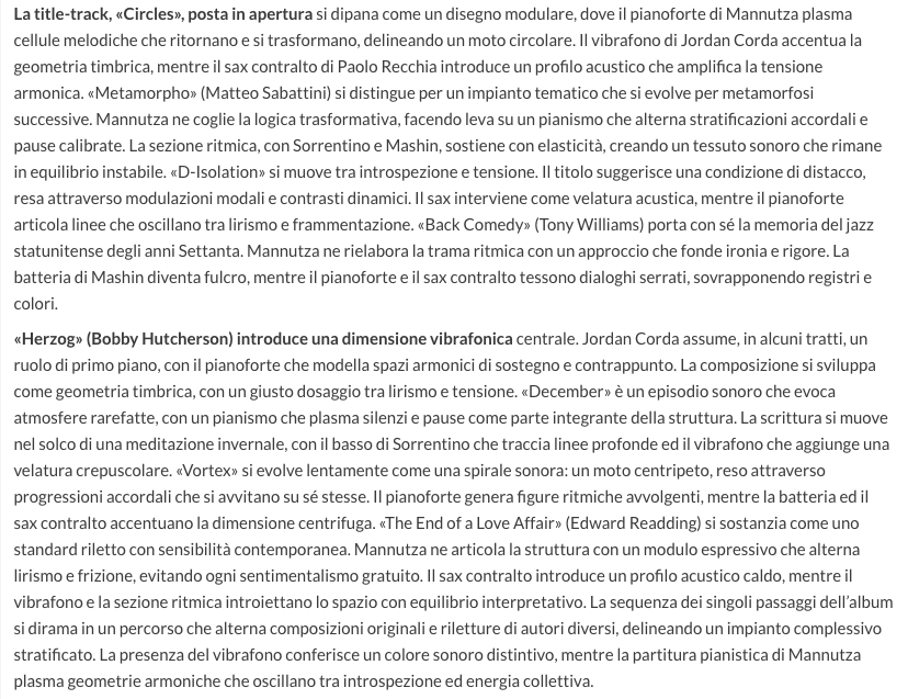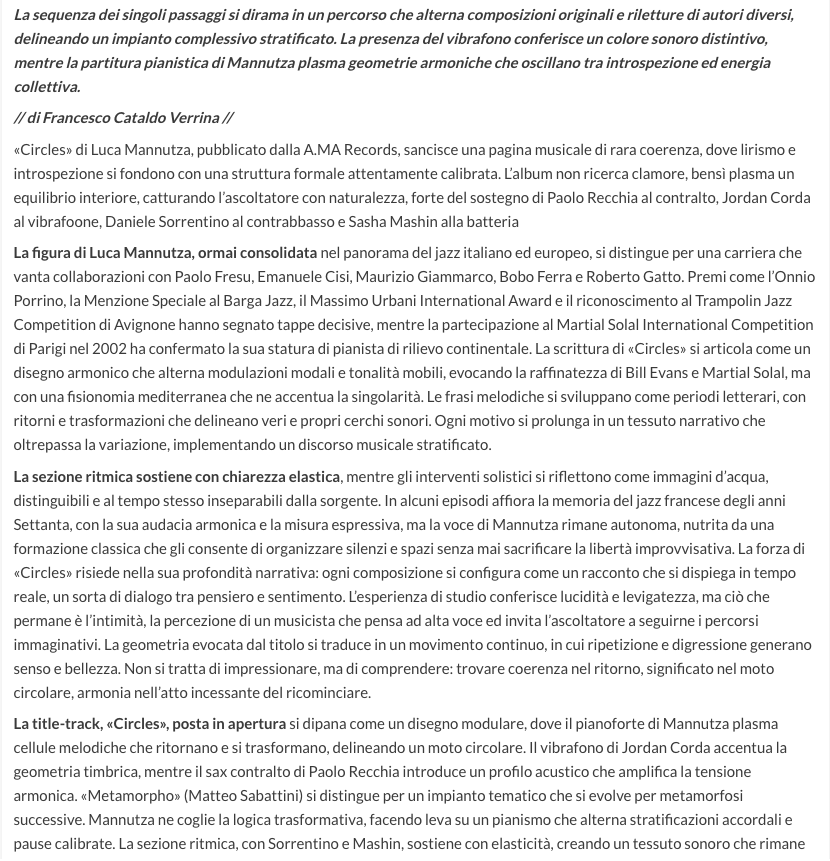 Doppio Jazz:"Luca Mannutza con «Circles»: la forma del pensiero armonico, tra equilibrio mediterraneo, introspezione e struttura" di Francesco Verrina