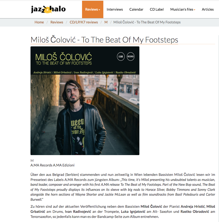 Jazzin.rs Magazine. 2025 Best Serbian Jazz Album:Milos Colovic "To The Beat Of My Footsteps"