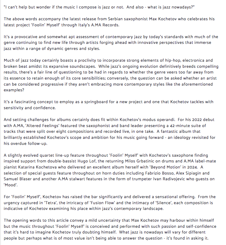 Blue In Green Radio: "Foolin'Myself" By Max Kochetov Quartet - Review By Imran Mirza