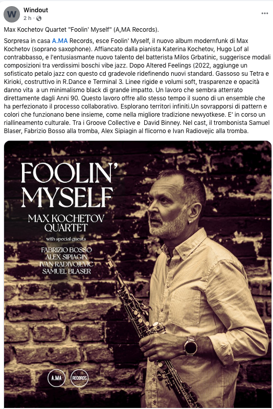 A surprise from A.MA Records: Foolin' Myself, the new modern funk album by soprano saxophone player Max Kochetov, is out. Joined by pianist Katerina Kochetov, double bass player Hugo Lof, and the exciting new talent of drummer Milos Grbatinic, he offers modal compositions amidst verdant woodland jazz vibes. After Altered Feelings (2022), he adds a sophisticated jazz petal with this pleasant CD, redefining new standards. Gassy on Tetra and Kirioki, constructive on R.Dance and Terminal 3. Rigid lines and soft volumes, transparency and opacity give life to a black minimalism of great impact. A work that seems to have landed directly from the 90s. This work also offers the sound of an ensemble that has perfected the collaborative process. They explore infinite territories. An overlapping of patterns and colors that work well together, in the best New York tradition. A cultural realignment is underway. Between Groove Collective and David Binney. The cast includes trombonist Samuel Blaser, Fabrizio Bosso on trumpet, Alex Sipiagin on flugelhorn, and Ivan Radiovejic on trumpet.