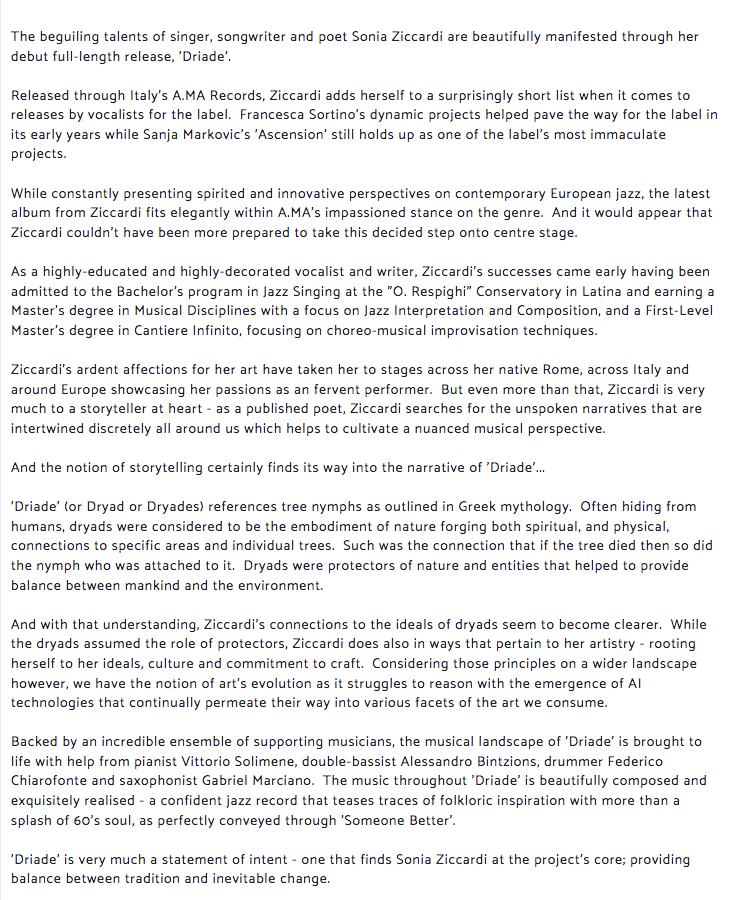 Doppio Jazz: "Driade" di Sonia Ziccardi: la voce come radico tra mito e introspezione musicale - Di Francesco Verrina