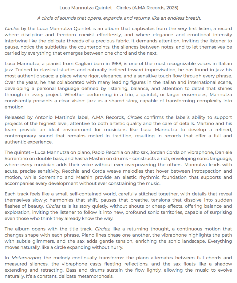 Redapolis Music Magazine - Circles - Luca Mannutza Quintet -A circle of sounds that opens, expands, and returns, like an endless breath. by Luca Paoli