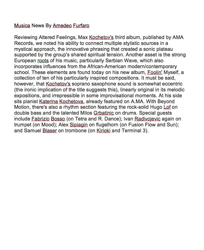 Musica News: Max Kochetov Quartet , Foolin'Myself" by Amedeo Furfaro