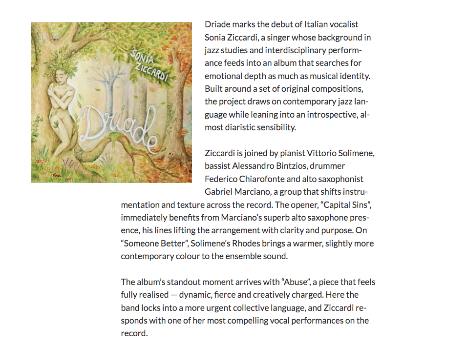 Doppio Jazz: "Driade" di Sonia Ziccardi: la voce come radico tra mito e introspezione musicale - Di Francesco Verrina
