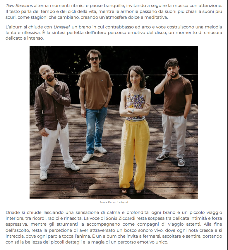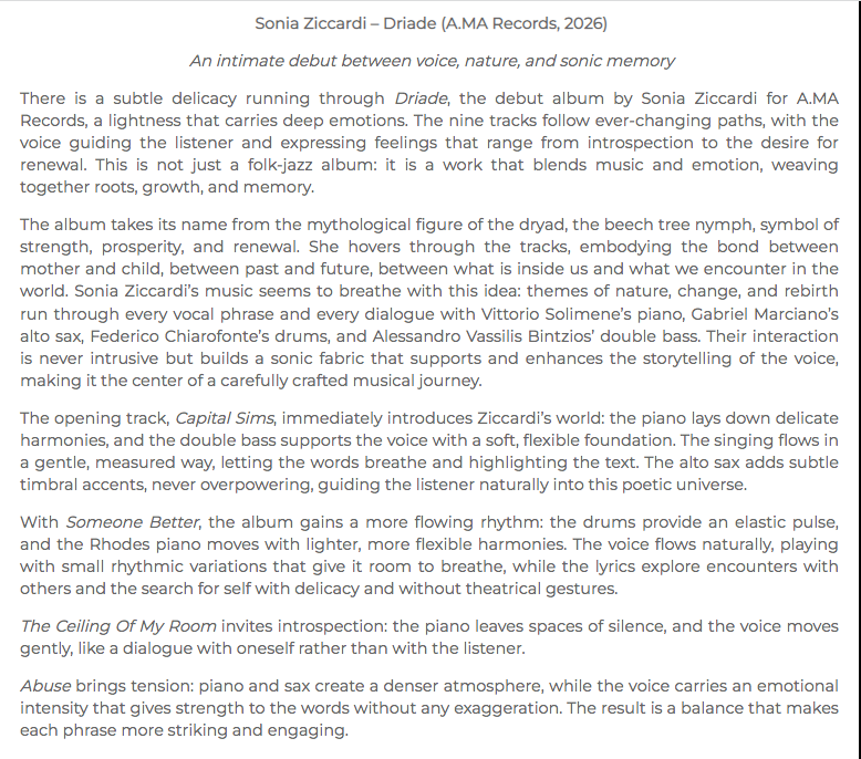 Doppio Jazz: "Driade" di Sonia Ziccardi: la voce come radico tra mito e introspezione musicale - Di Francesco Verrina